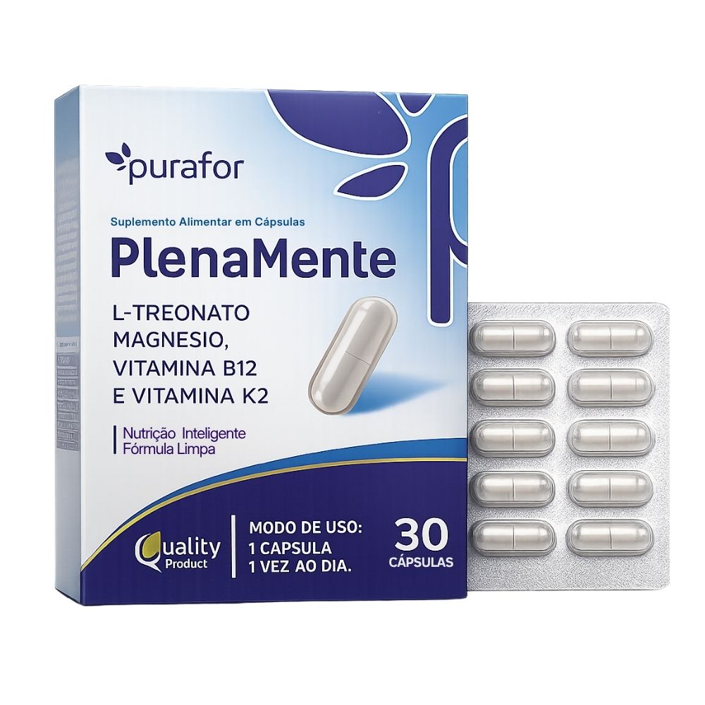 O Plenamente Magnésio L-Treonato + B12 + K2 é um suplemento desenvolvido para suporte da saúde cerebral, cognitiva e do sistema nervoso.